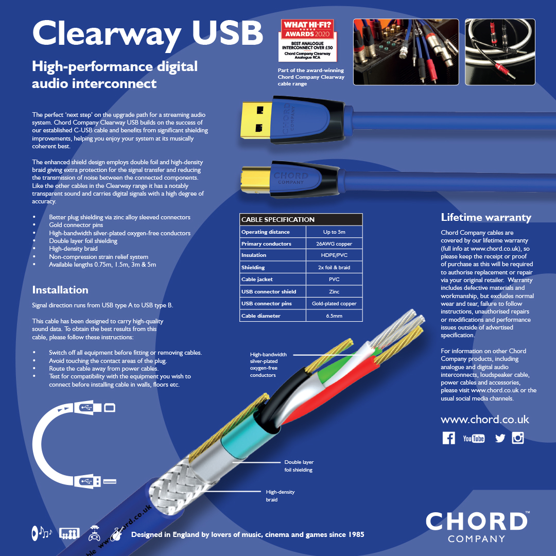 De Chord Company Clearway USB digitale audio-interconnect is de perfecte ‘volgende stap’ op het upgradepad voor een streaming audiosysteem. Chord Company Clearway USB bouwt voort op het succes van onze gevestigde C-USB-kabel en profiteert van aanzienlijke verbeteringen in de afscherming, zodat u op muzikaal coherente wijze van uw systeem kunt genieten. Het verbeterde schildontwerp maakt gebruik van dubbele folie en vlechtwerk met hoge dichtheid, wat extra bescherming biedt voor de signaaloverdracht en de overdracht van ruis tussen de aangesloten componenten vermindert. Net als de andere kabels in het Clearway-assortiment heeft het een opmerkelijk transparant geluid en draagt het digitale signalen met een hoge mate van nauwkeurigheid over.