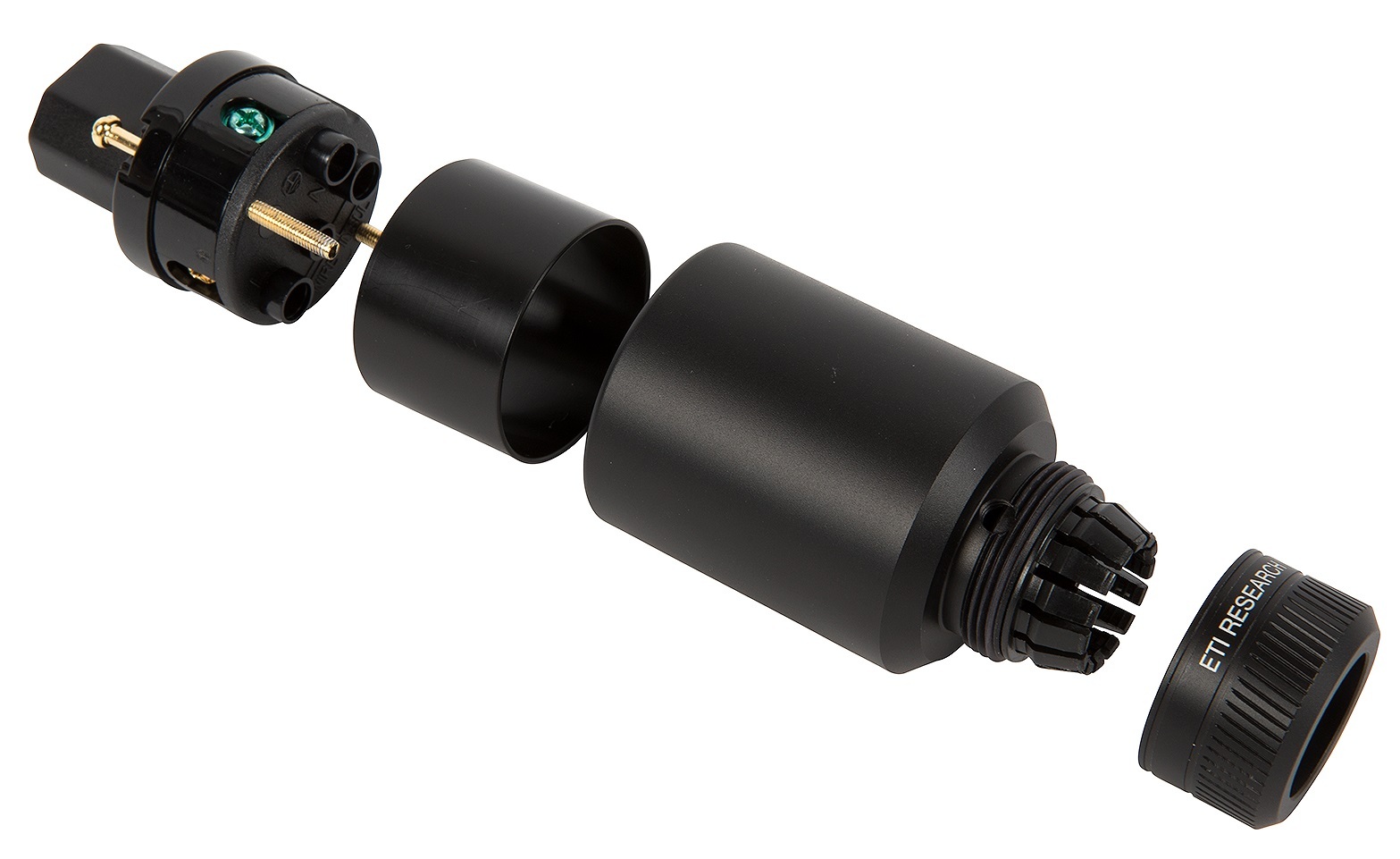Deze AC Power Connector, in simpel Nederlands netstekker, van ETI Research is gemaakt voor degenen die het allerhoogste niveau op het gebied van dergelijke connectoren in huis willen halen. Deze netstekker is zeer geschikt voor gebruik als high end audiokabel. De contactpennen zijn gefreesd uit 1100 Series koper met een IACS waardering van 102%. 1100 Series koper beschikt over een uniform fijne structuur hetgeen garant staat voor de beste signaaloverdracht. Na vervaardiging worden de koperonderdelen gereinigd en vervolgens verguld. De goudlaag wordt direct (zonder slechtgeleidende hechtlagen) op het koper aangebracht. Om in- en afstraling (EMI/ RF) te voorkomen, wordt de connector gemonteerd in een hoogwaardige aluminium (6061) behuizing. Een zelfcentrerende polymeren binnenhuls voorkomt dat spanningdragende kabeldelen in contact kunnen komen met de behuizing. Een zelfspannende polymeren trekontlasting met aluminium spanmoer maakt probleemloze toepassing van kabels tot 20 mm mogelijk. Deze netstekker is van hetzelfde hoge niveau als de Legato Schuko Netstekker, maar dan uitgevoerd met IEC deel. Iedere stroomkabel die aan de ene kant is uitgevoerd met een Legato Schuko en aan de andere kant met een Legato IEC deel van ETI Research zal op 102% van zijn kunnen presteren.