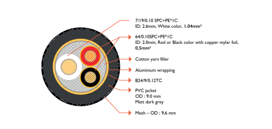 • Drievoudige afscherming voor perfecte isolatie tegen elektromagnetische en radiofonische interferentie (RFI & EMI): Hot-pin en cold-pin geleiders geïsoleerd met koper-mylarfolie. Centrale kern gevuld met katoenvezel om microtrillingen aan de binnenkant te beperken, perifere isolatie in aluminium strip en dik PVC aan de buitenkant.