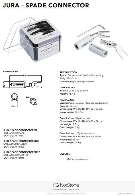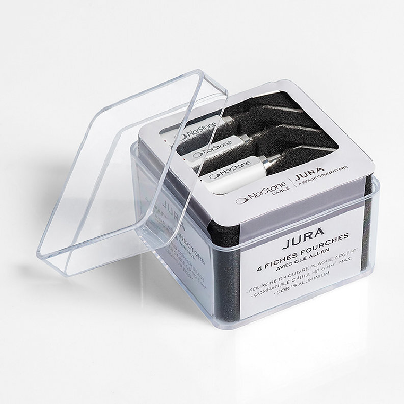 NorStone Jura spade connector is gemaakt van verzilverde koperen connectoren en een aluminium behuizing. De NorStone spade-connector is ontworpen om een optimaal contact tussen de kabel en de luidsprekers of versterker te garanderen en is eenvoudig te monteren, waardoor de signaalintegriteit behouden blijft en overdrachtsverliezen worden geminimaliseerd. De NorStone Jura-spadeconnector is compatibel met kabels met een doorsnede tot 6 mm² en helpt de prestaties van uw systeem te optimaliseren en tegelijkertijd het bekabelingsproces te vereenvoudigen.