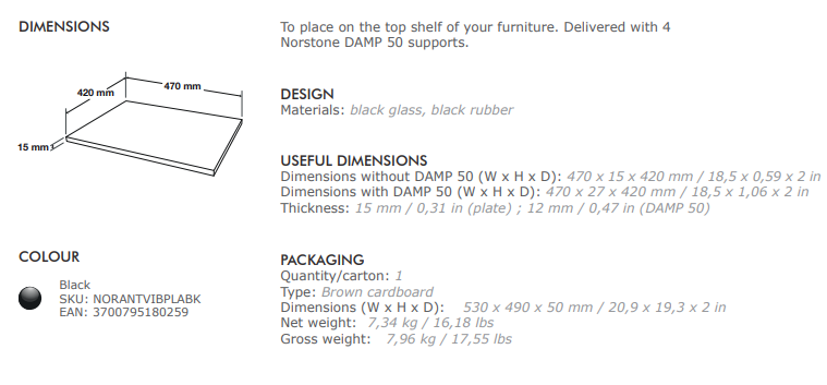 De NorStone Spider Anti-vbration & DAMP-50 glasplaat is bedoelt voor een verbeterde ontkoppeling van uw audio apparatuur op een meubel. Bij deze akoestisch behandelde glasplaat worden 4 rubberen Damp-50 meegeleverd. De Norstone Anti Vibration Glass Plate kan worden gebruikt in combinatie met uw eigen meubel of in combinatie met de volgende Norstone hifimeubels / audioracks: Norstone Spider, Norstone Bergen 2, Stabble Hifi (zwart en bamboe), Square Hifi en Epur 4.