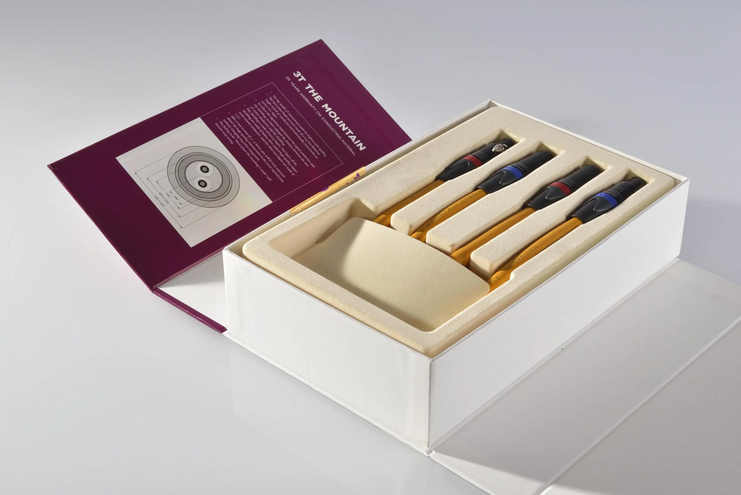 De Van den Hul 3T Moutain Hybrid is het topmodel uit de 3T-reeks. De twee middelste geleiders zijn gemaakt van een 900 micron 3T enkelstrengige geleider en individueel gecoat met een extra L.S.C.-laag. Verminderde capacitieve belasting door de grotere afstand tussen de middengeleiders en de afscherming. De afscherming bestaat uit vier gelijkmatige lagen: twee gemaakt van zware, met zilver gecoate, hoogwaardige koperen meeraderige geleiders en de andere twee zijn gemaakt van L.S.C. Na een inlooptijd (inbranden) van drie tot vijf uur ervaart u een dramatische verbetering van de geluidsoverdracht.