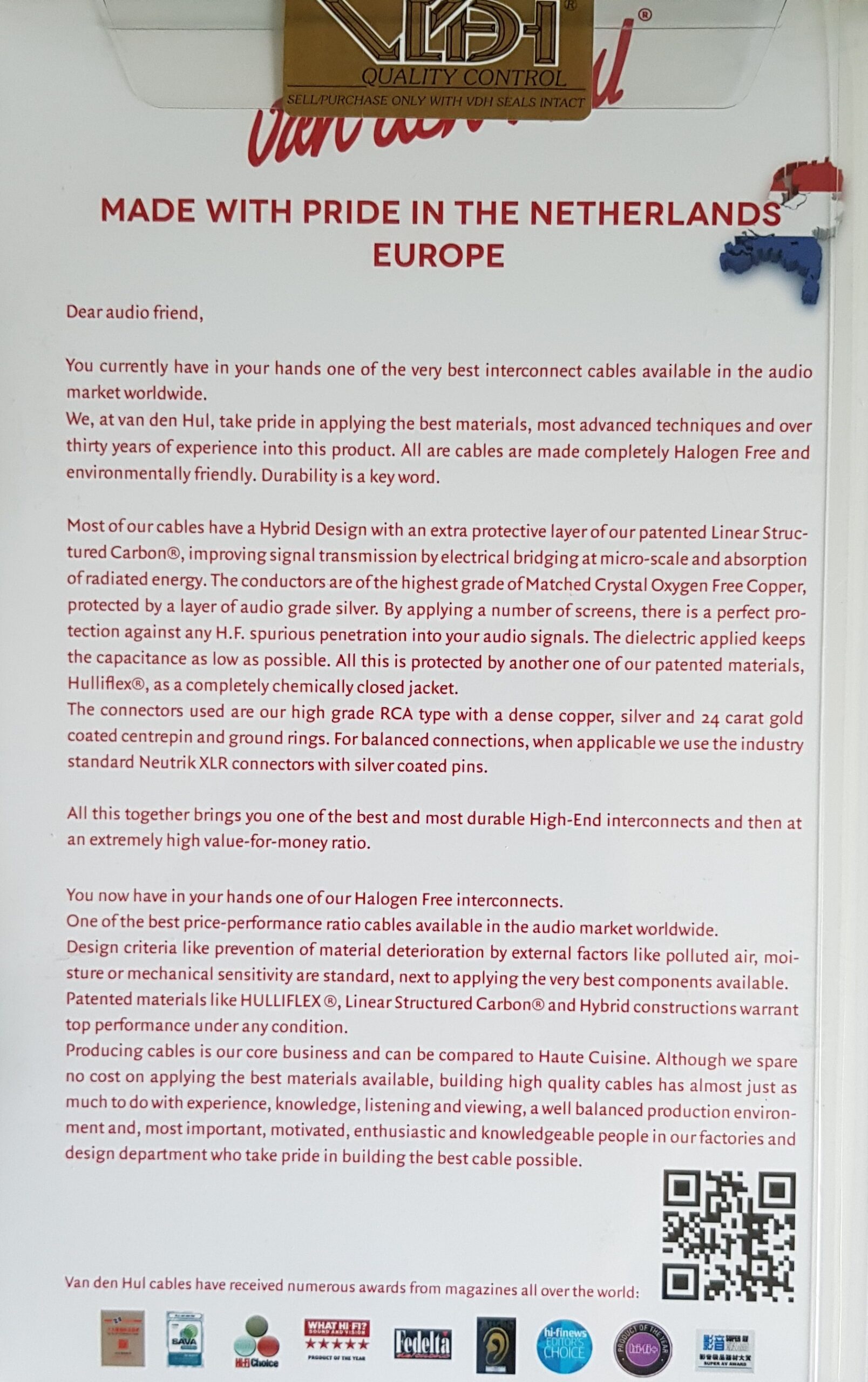 De Van den Hul voorgemonteerde kabels worden in eigen werkplaats in Nederland gefabriceerd. Er wordt gebruik gemaakt van de best verkrijgbare montage- en productie-materialen. Alle kabels zijn voorzien van originele Van den Hul connectoren. Op voorgemonteerde kabels wordt 30 jaar onvoorwaardelijke klankgarantie verleend.