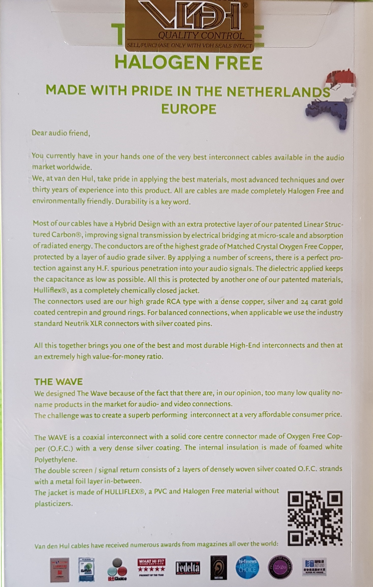 Van den Hul The Wave is een coaxiale, drievoudig afgeschermde RCA interconnect, van zeer hoge kwaliteit met uitstekende ruisonderdrukkingseigenschappen. The Wave is geschikt voor gebruik als een audio-interconnect bij het bedraden van je thuisbioscoopopstelling, bij de verbinding streamer, cd- of dvd-speler naar versterker of in elke andere hifi-lijnniveau-bedradingstoepassing.